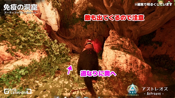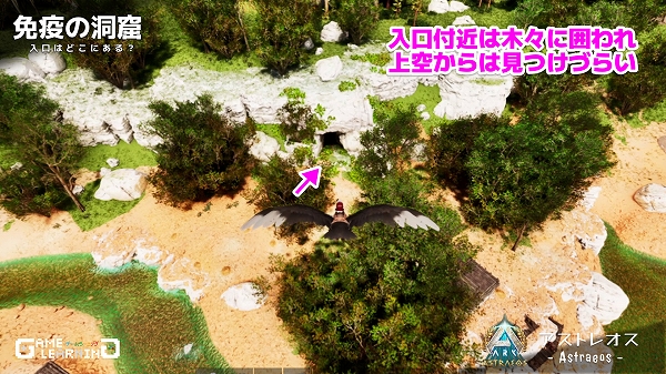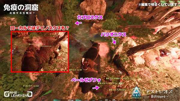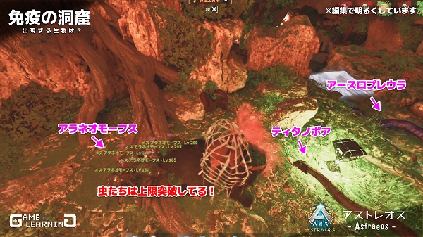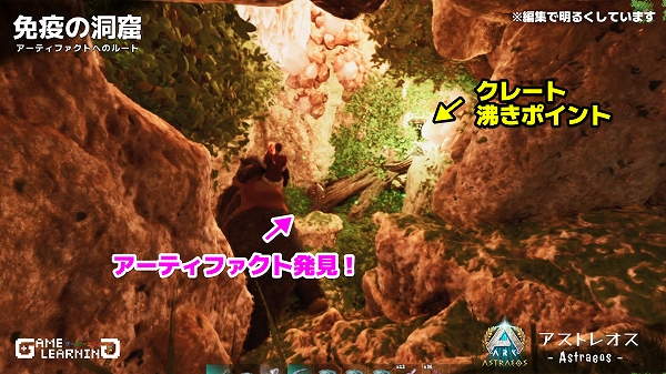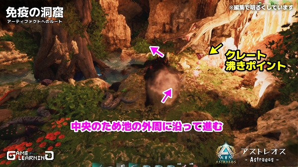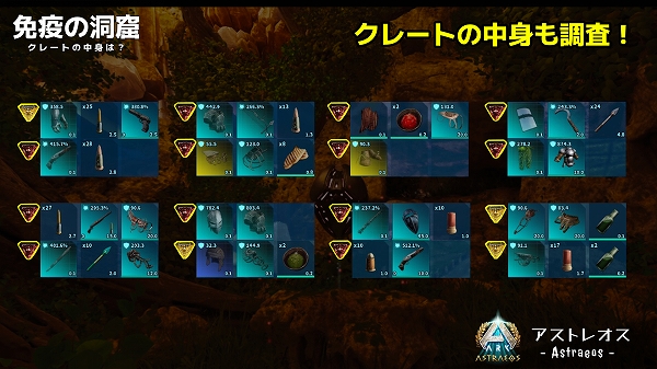アストレオスでは貴重なギガノトサウルスやリニオグナタ、デイノスクスのサドルが出る沼地クレートのようです。クレートの沸き数が少ないものの、ガスマスクさえ用意できれば手軽に回れる洞窟なので、他マップより回りやすいかもしれませんね。