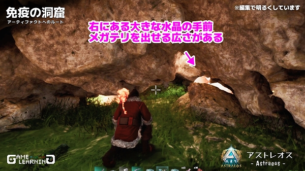 少し進んだ先、右側に光る水晶が見えたら、その手前が広くなっておりメガテリを出すことができます。通路は一本道なので騎乗して奥へ