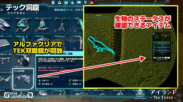 最高難易度のアルファをクリアすることで生物のステータスを確認できる「TEK双眼鏡」のエングラムが解放される。昏睡値やステータスのポイントなど、ARKをより楽しむためにはぜひ入手したいアイテムになっています。