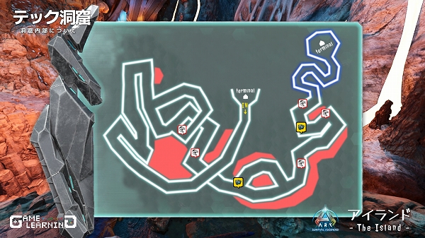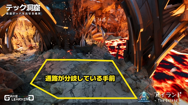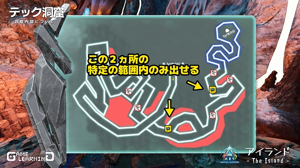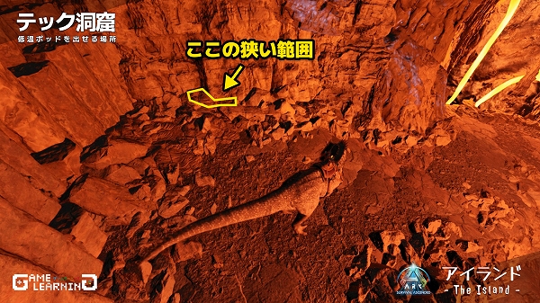 通常TEK洞窟内は低温ポッドで生物を出すことができません。入口から引き連れて最奥のターミナルまで連れていくのが主流でしたが道中に低温ポッドが使用可能な場所がありました。
