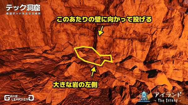 岩が並んでいる場所の中央付近に横長の大きな岩があります。その左側から奥。壁側に向かって出すとやりやすかったです。