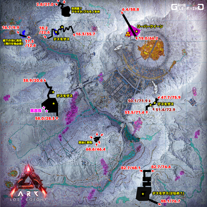 そのかわりに東西南北に様々なサイズの洞窟がありデスモダスが生息しています。一部洞窟ではクレートも各最大4個、マップ固有生物のサドルが出たりと多く魅力的なものも多いです。