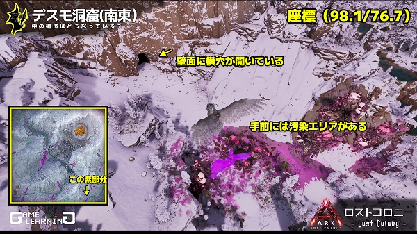 座標98.1/76.7付近。汚染エリア近くの山の壁面に大きな横穴が開いています。