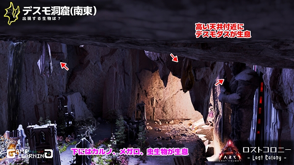 凶悪なデスモダス、アースロプレウラやティタノボアなどの洞窟では定番生物、メガロサウルスやダイアウルフなどが生息しています。能力が高い飛行生物で序盤に味方につけたいデスモダスですが、この洞窟は天井が高く、危険生物も多いため序盤のテイムにはあまり向かない印象でした。