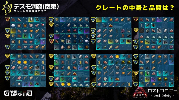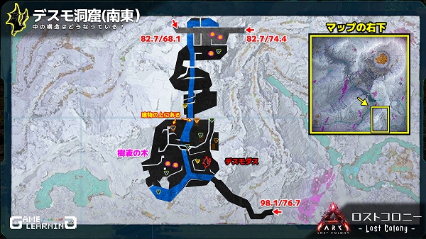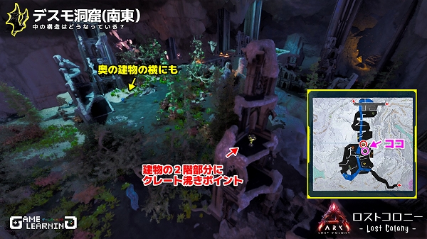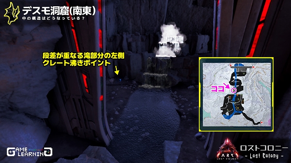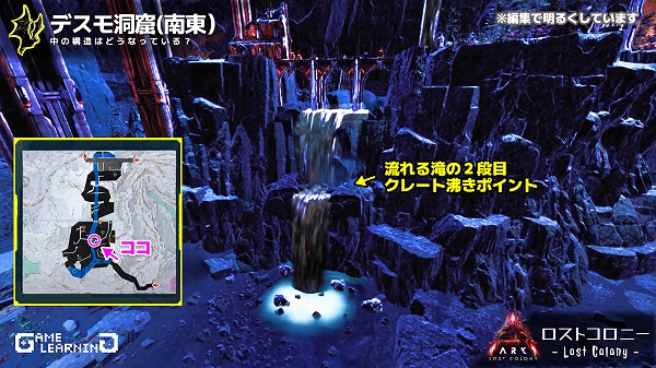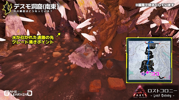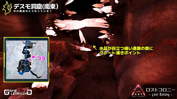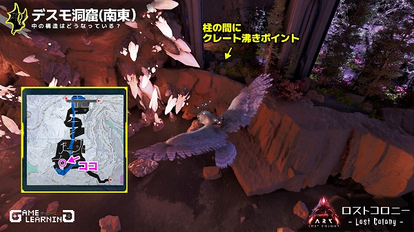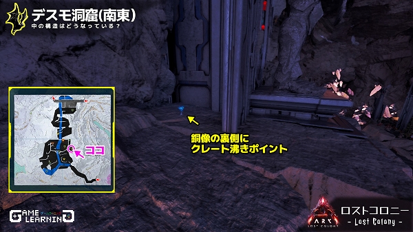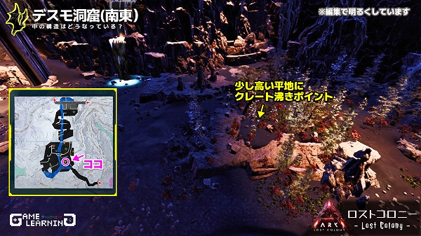 高低差はあるもののそこまで広くはなく、クレートの場所も複雑ではないためサクッと回れる洞窟ではあると思います。デスモダスさえ注意し、敵生物を対処できるようであれば新生物サドルを目的に回ってみてもよいかもしれませんね。
