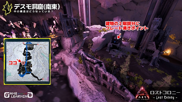 さらにクレート沸きポイントの中には建物2階部分に沸いていたり高所にあるものだったりする箇所が多く、構造的にも飛行生物が必須の洞窟となっています。