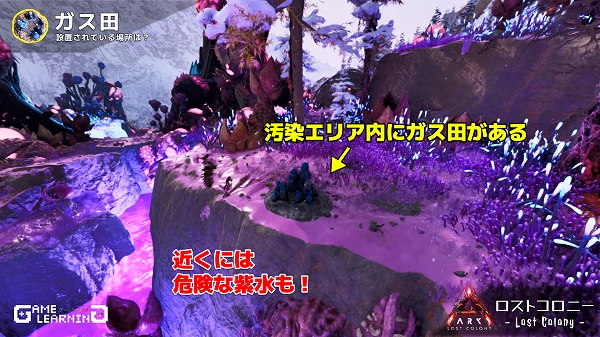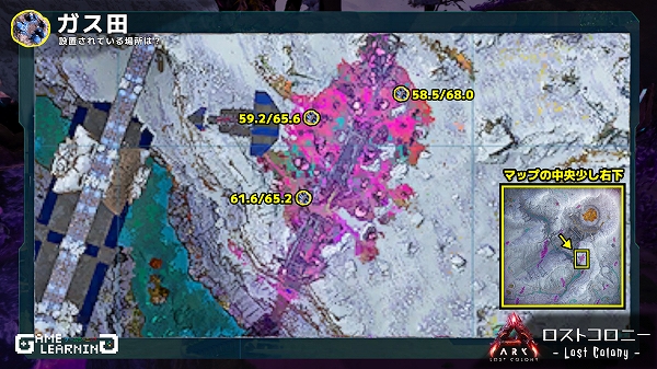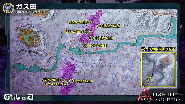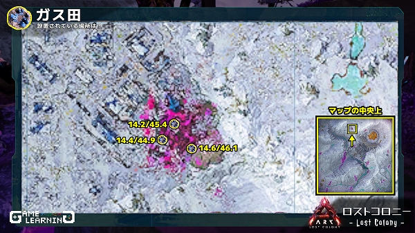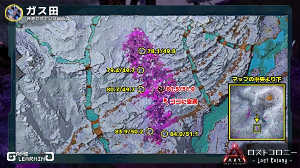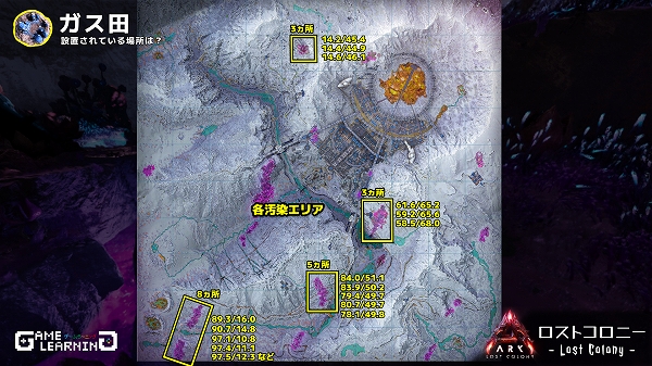 ARK: Survival Ascendedのロストコロニーマップのガスポールを獲得するのに必要なガスコレクターを設置できるガス田。その設置可能な場所を調査!拡大マップの座標付きでエリアのどこにあるのかもご紹介!