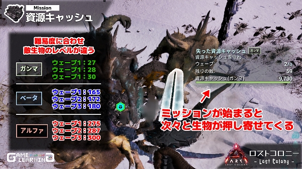 「資源キャッシュ」は他のミッション同様に難易度に合わせ敵生物のレベルが異なります。