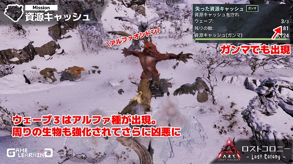 どの難易度でもウェーブ3ではアルファ種が出現。オシドンやティラノ、カルノなど様々確認できています。ガンマのレベル30でもアルファ種に加え大量の凶悪生物では危険ですね。