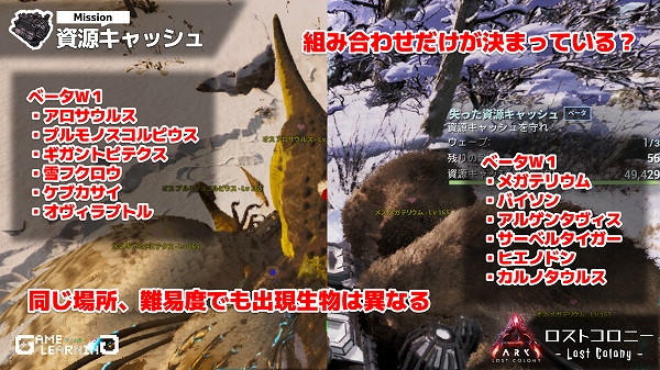 出現する生物は難易度や設置場所で同一ではなく、同じ場所・同じ難易度でも異なる生物が出現していました。体感ですが組み合わせのみが決まっているぽく、カルノやアロ、デスモダス、クライオロフォサウルス、オシドンなどの厄介な生物は一緒に出ないようにされているかもしれません。