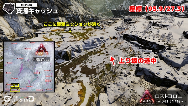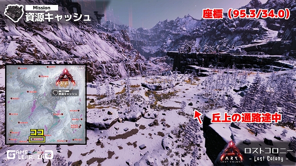 10カ所目は座標95.9/27.3。上り坂の途中にあるハの字型の地形の手前に設置されています。
