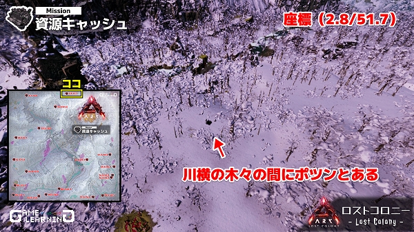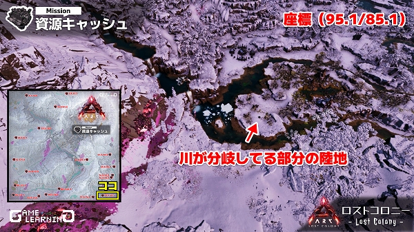 14カ所目は座標95.1/85.1。川が分岐している境目の陸地部分に設置されています。