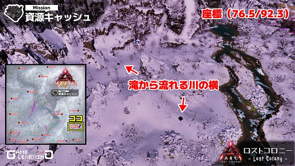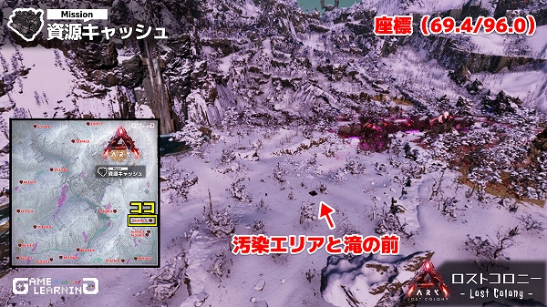 17カ所目は座標69.4/96.0。汚染エリアと滝の前の平地に設置されています。