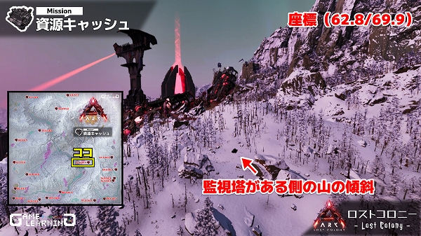 18カ所目は座標62.8/69.9。監視塔がある山の傾斜部分に設置されています。