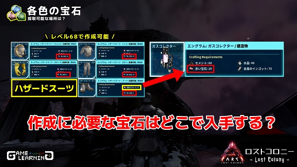 放射線からプレーヤーの身を守るために必要な「ハザードスーツ」では独自のアイテムである「ガスボール」や「赤い宝石」「青い宝石」が必要となってきます。いずれもロストコロニーマップないではしっかり採取可能なアイテムとなっておりました!