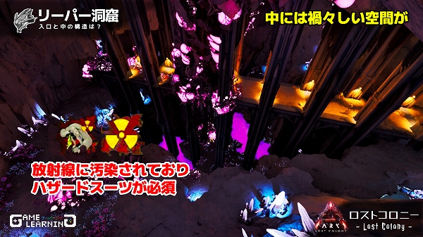 ARK: Survival Ascendedのロストコロニーマップのリーパーが生息する洞窟を調査!放射能に侵されたエリアがマップ内に!?おひとり様でも受胎できるの?内部構造や放射能エリアに向かうための資材などを開設!