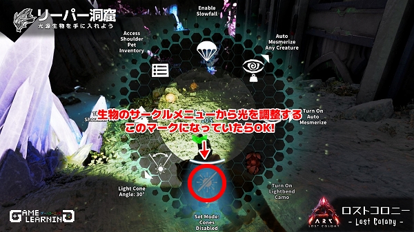 テイムしたグルーンは肩乗せ生物となり、サークルメニューの一番下に光の設定があります。