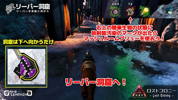 洞窟を進んでいくと右上にある騎乗生物のステータス画面に放射線汚染のマークが出てきます。出現したらマッシュルームブリューを使用してください。マッシュルームブリューは1つずつしか使用できず、時間を積み立てることができません。切れてからしか使えないので忘れないようにしてくださいね。