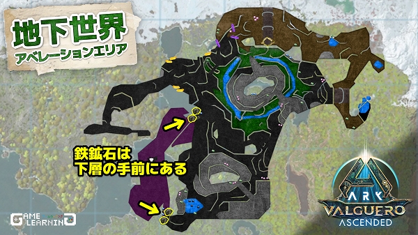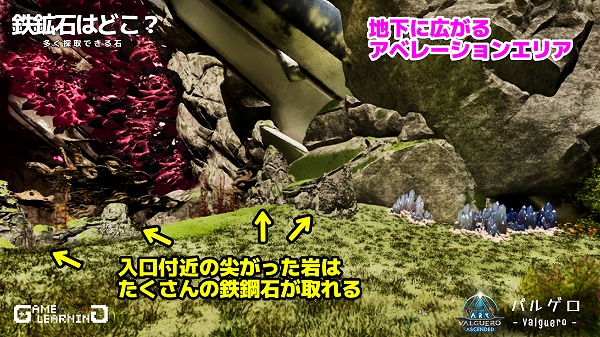 下層の入り口横にある棘のような岩が鉄鉱石が多く採取可能な岩です。
