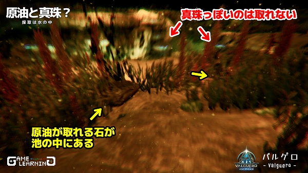 池の中にはオイルが漏れ出た石があり、ピッケルなどで採取可能です。