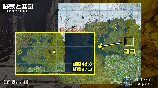 マップの右側。山岳地帯の中、座標46.8/87.3付近にあります。
