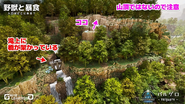 座標付近には滝上に橋が架かっている場所があり、その一段上の山の上にあります。