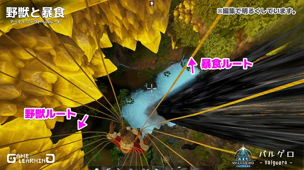 滝の水を背に左側が野獣ルート、右側が暴食ルートがあります。