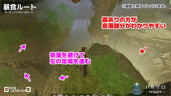 奈落エリアは境目がわかりづらく、霧ありのほうが見やすいです。