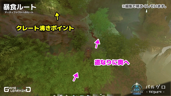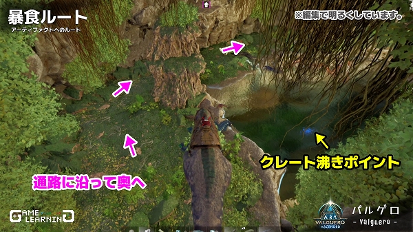 左壁の広い足場には1段上にクレート沸きポイントがあります。