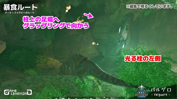 光る柱の左側についたら、柱上に見える足場へグラップリングフックで向かいます。