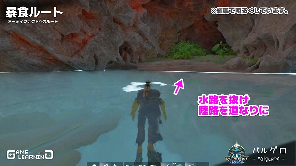 道なりに進んだ先は細い通路の先に水たまりがあり水中を進みます。