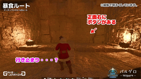 行き止まりのようにみえますが、正面右の壁にボタンがあります。
