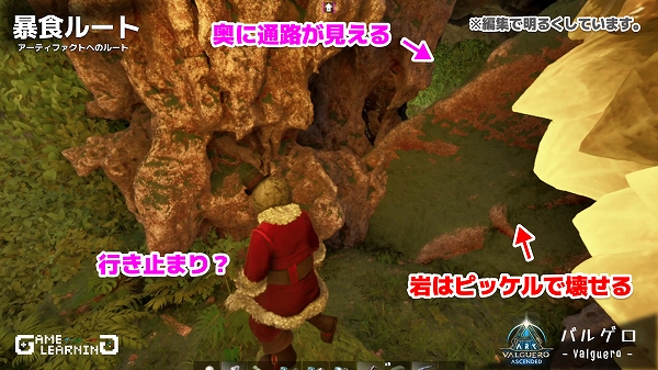 途中岩で通路が閉ざされており、進めなくなっています。岩はピッケルで壊せるようになっており、上の隙間から奥に通路が見えます。