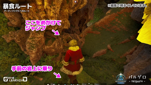壊せる岩の手前にある岩に乗り、少し前の段差にある岩上にジャンプします。