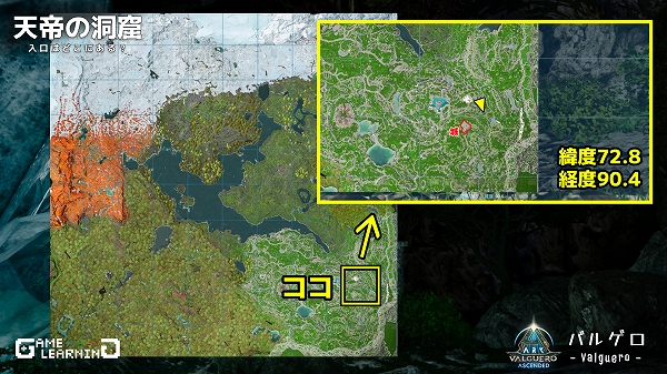 座標72.8/90.4付近に洞窟の入口があります。