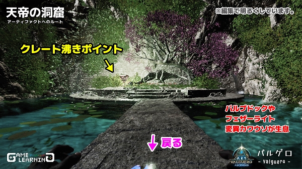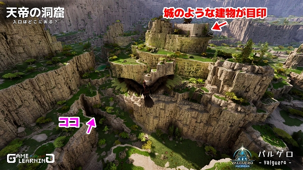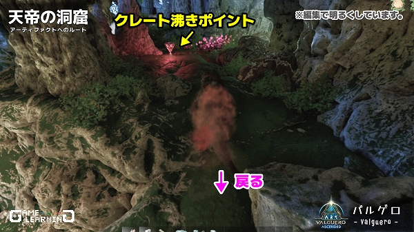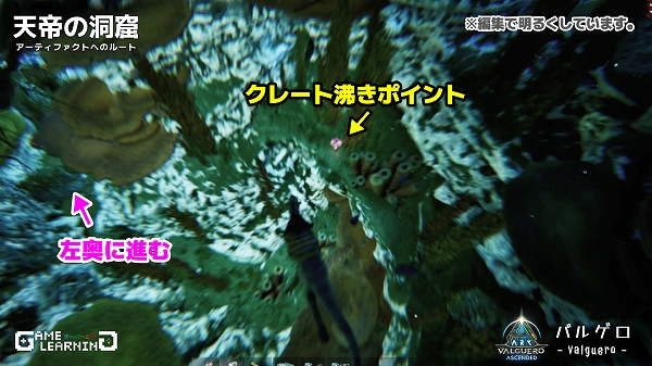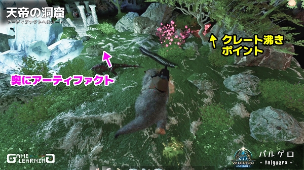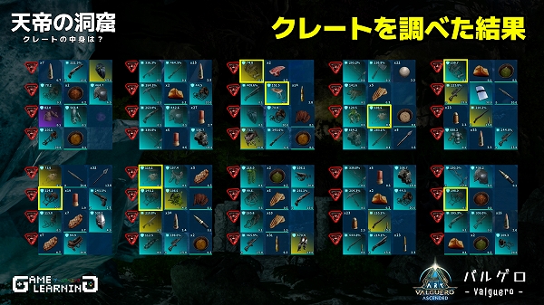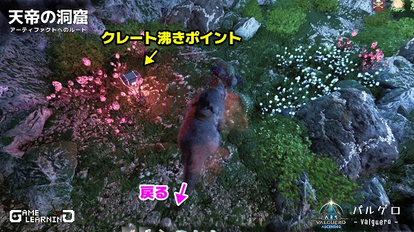 クレート位置の把握や戦闘が楽なメガテリウムで紹介していますが、中はアルゲンタヴィスなどの飛行生物でも入れるので戦力がそろっていなくても一部だけサクッととることも可能です。