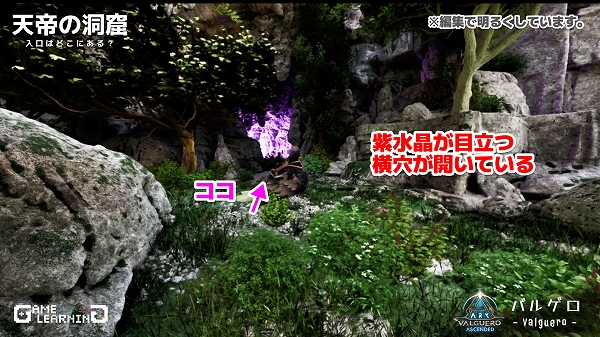 入口は壁の壁面に穴があいており、中に紫水晶が光っているので目立ちます。