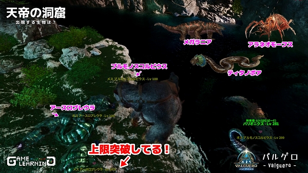 洞窟では定番の生物に加え、メガラニアが出現。さらにレベル上限が突破しており凶悪です。